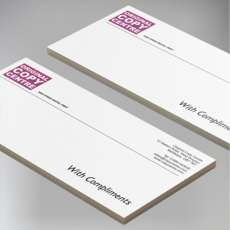 All compliments slips are printed on premium 120gsm white bond paper, to match our letterheads.