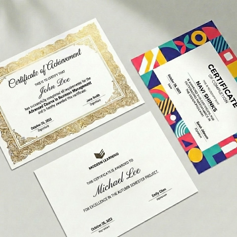 • Uncoated Card:  This stock has a natural, premium texture that exudes quality. It is easy to write on with any pen, making it perfect if you plan to hand-sign the certificates or add dates manually after printing.