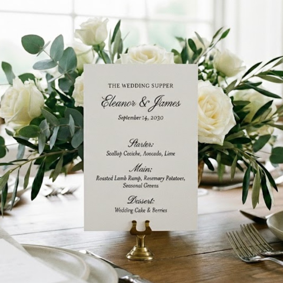 Elevate your wedding tables with beautifully printed menu cards that complement your theme. Our wedding menus are produced with care and with an emphasis on quality.