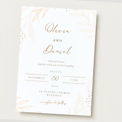 Our flat invitations are printed on high-quality card. Available single or double-sided, they are ideal for main ceremony invites, evening reception cards, or simple Save the Dates. View prices